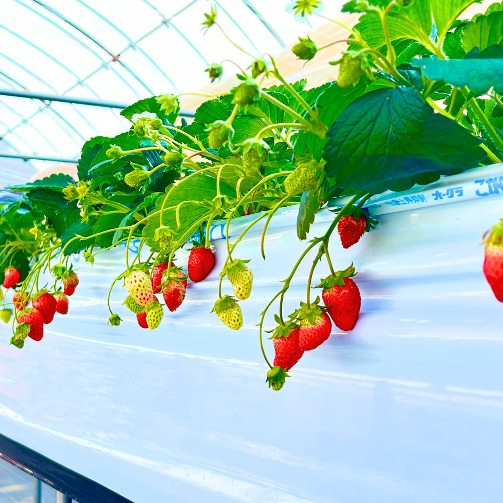 そこで当園では、イチゴを高い位置で育てる高設栽培を取り入れています。土がつきにくく、雨の跳ね返りによる汚れや雑菌も防げるため、実がいつも清潔なまま育ちます。