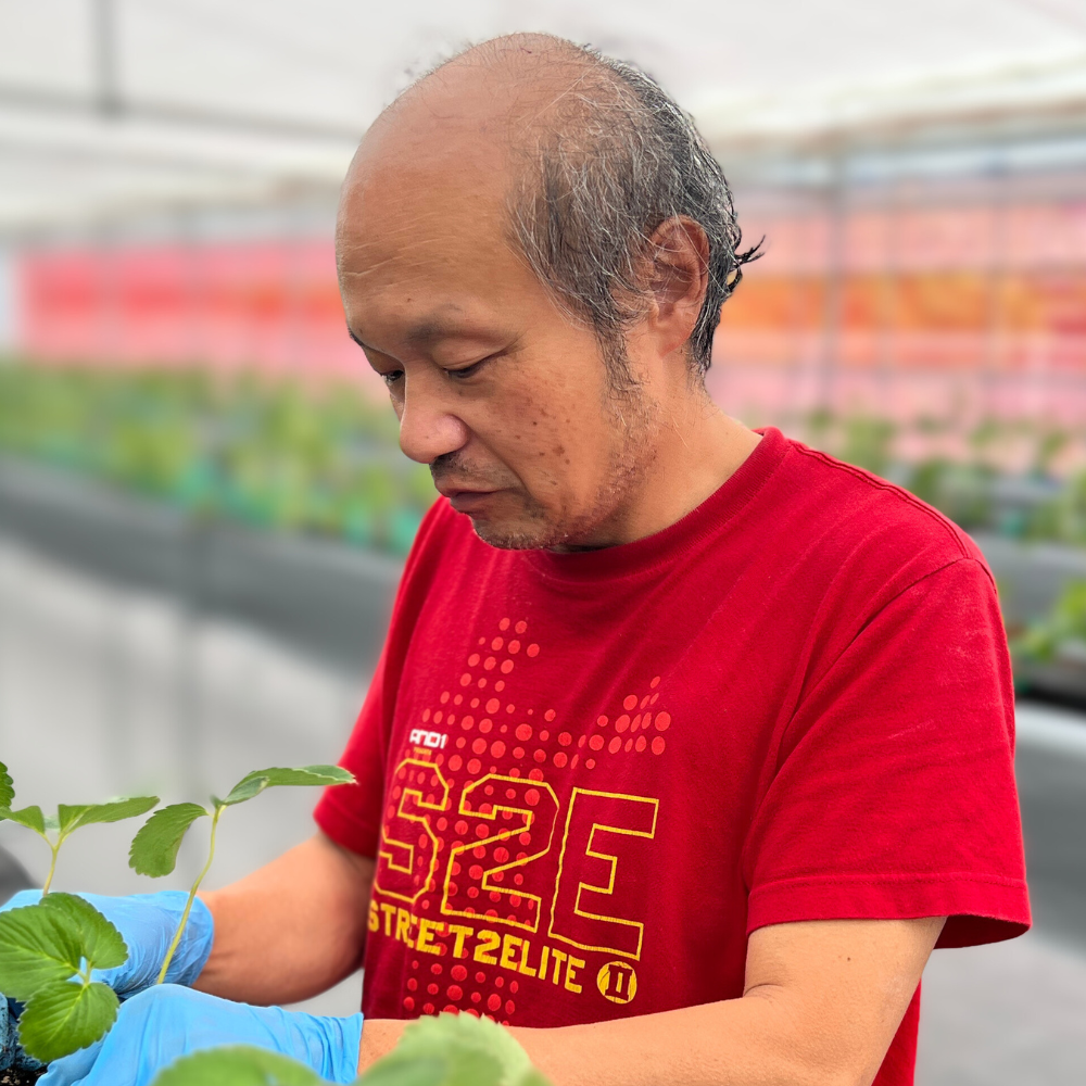 農家がハウスの中を回り、1500株以上ものいちごの株を一つ一つチェックしながら、元気な株、実のつき方、色づき具合を観察しています。